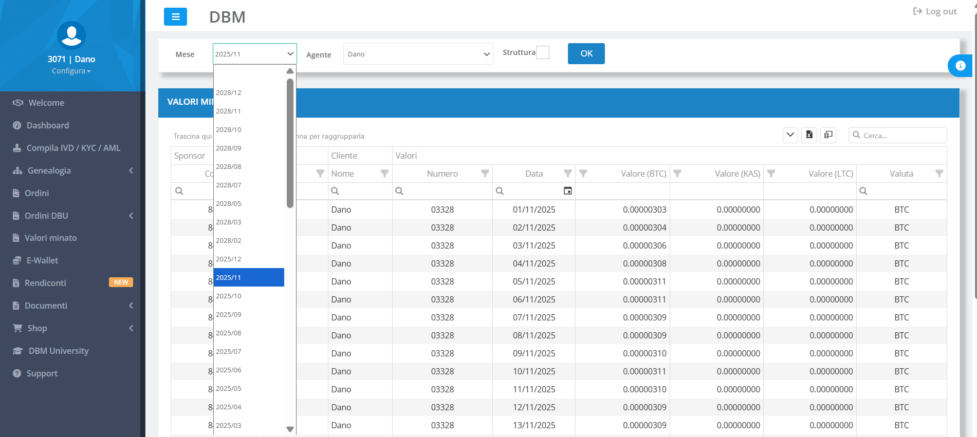 La voce VALORI MINATO offre la possibilità sia ai Clienti che agli agenti di poter visualizzare la produzione giornaliera della propria/e macchina/e con la possibilità di effettuare delle ricerche per singolo mese o anche della propria struttura (quest'ultima solo per gli Agenti).