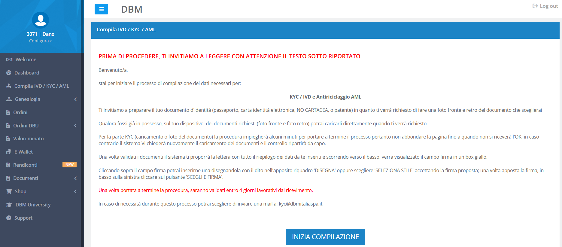 Una volta effettuato Il completamento della procedura IVD/KYC/AML, DBM ITALIA avrà 4gg (lavorativi) di tempo per verificare la correttezza dei dati e validarli.