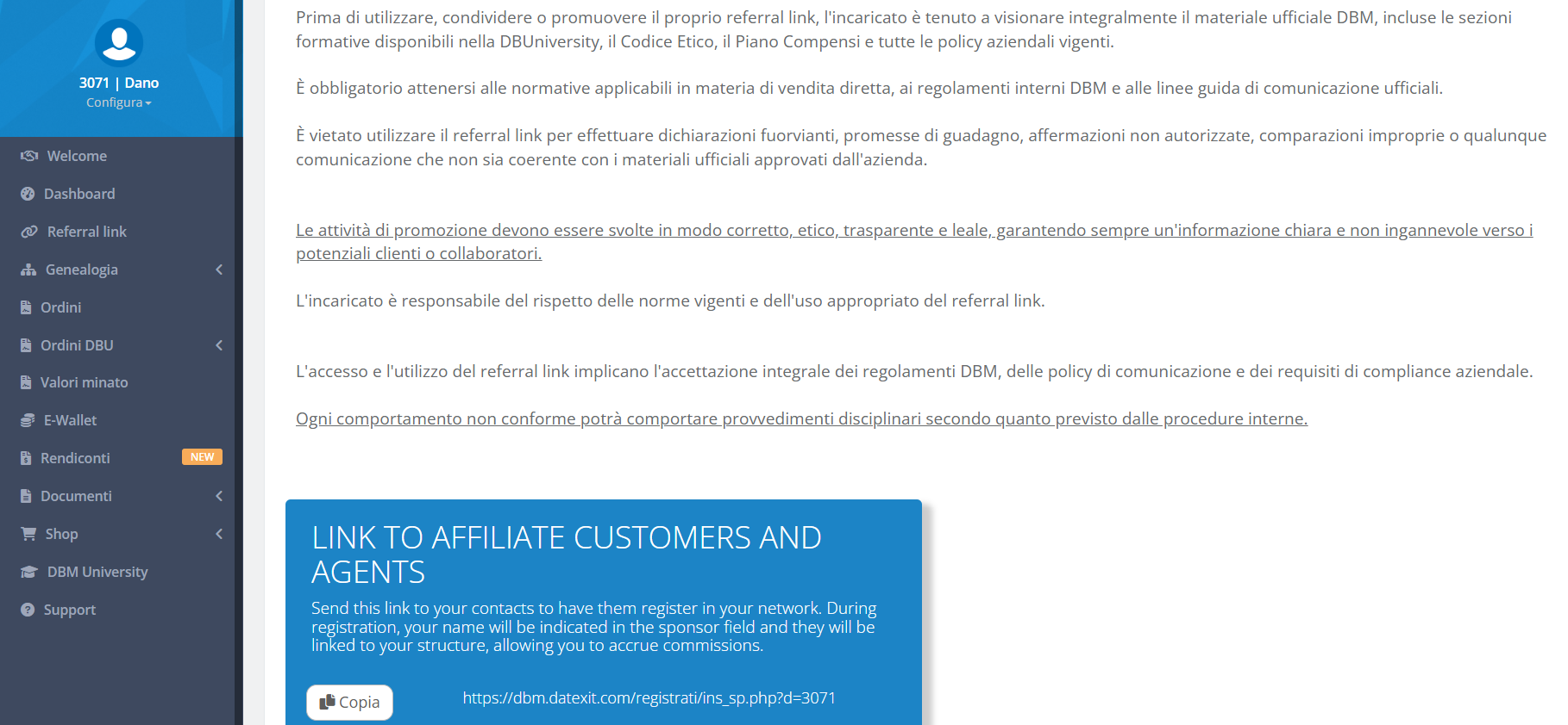 Nella pagina Referral Link presente solo per gli Agenti si potrà visualizzare il proprio Link per poter affiliare sotto la tua struttura sia Clienti che Agenti.