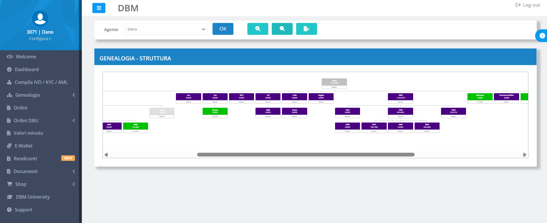 Nella pagina GENEALOGIA, presente solo per gli Agenti, si potrà visualizzare la propria intera rete in due modalità:
