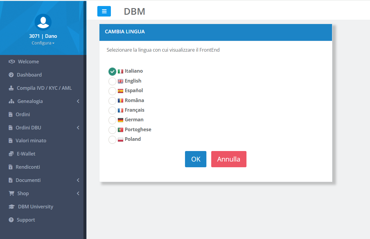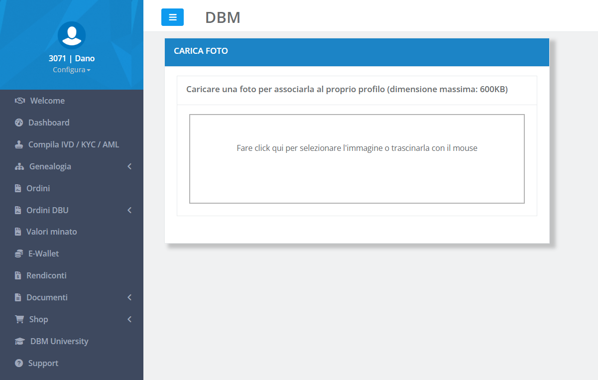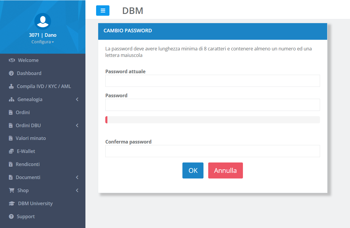 Sopra la scritta 'onfigura' troviamo un numero di 4 cifre che rappresenta il codice cliente/agente della persona e accanto si trova invece la 'username' cioè il nome alternativo che apparirà come riferimento nella nostra struttura e/o nella struttura del nostro sponsor.